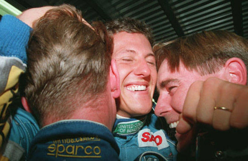 1 994 GP Αυστραλίας: Ο Schumacher αγκαλιάζει τους μηχανικούς της Βenetton μετά την στέψη του ως παγκόσμιου πρωταθλητή της F1 για πρώτη φορά , αφού προηγήθηκε η σύγκρουση με τον βασικό αντίπαλό του Ντέιμον Χιλ στην διάρκεια του αγώνα.