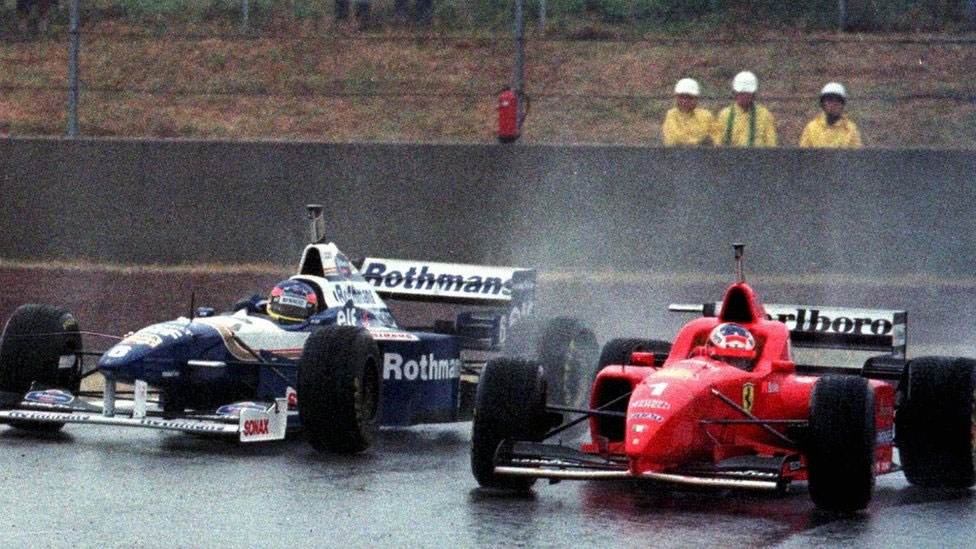 1996 GP Ισπανίας : Σε καταρρακτώδεις συνθήκες , ο Γερμανός προσπερνά με περίσσεια μεγαλοπρέπεια τον έναν μετά τον άλλο τους αντιπάλους του, όπως και τον Ζακ Βιλνέβ στην φωτογραφία και εξασφαλίζει την πρώτη του νίκη με τη Ferrari