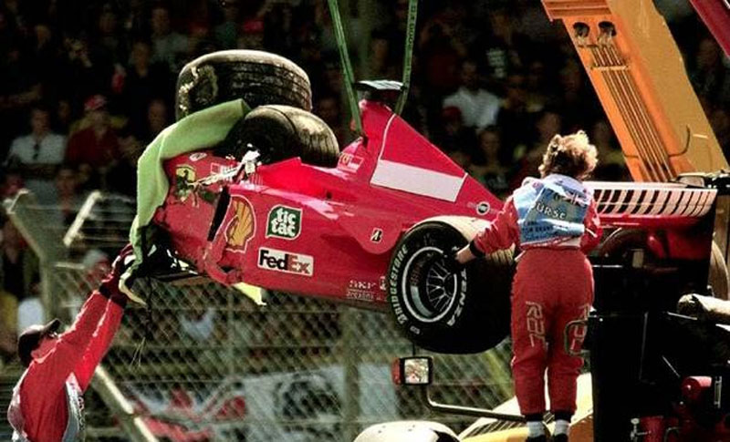 1999 Βρετανικό GP : ‘Οτι απέμεινε από το μονοέσιο του Σούμι, μετά την πρόσκρουσή που είχε στην στροφή Stowe στην πίστα του Σιλβερστόουν. Ο Γερμανός εγκαταλείπει τον αγώνα με ένα σπασμένο πόδι και συγχρόνως οι όποιες ελπίδες είχε για κατάκτηση του τίτλου εξανεμίσθηκαν.