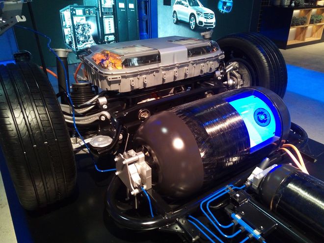 Τώρα, η δεξαμενή του υγρογόνου, βρίσκεται κάτω από τα πίσω καθίσματα, που ανασηκώθηκαν κατά 3 εκ. για να χωρέσει. Γεμίζει με 4,4 κιλά υδρογόνου και το Mercedes-Benz GLC F CELL έχει συνδυασμένη κατανάλωση υδρογόνου 0,34 κιλά / 100 χλμ., και συνδυασμένη κατανάλωση ηλεκτρικού ρεύματος 13,7 kWh / 100 χλμ.) Αμιγώς ηλεκτρικά η μπαταρία μπορεί να κινήσει το όχημα για 51 χλμ. (κύκλος NEDC) και μαζί με το υδρογόνου συνολικά 478 χλμ.