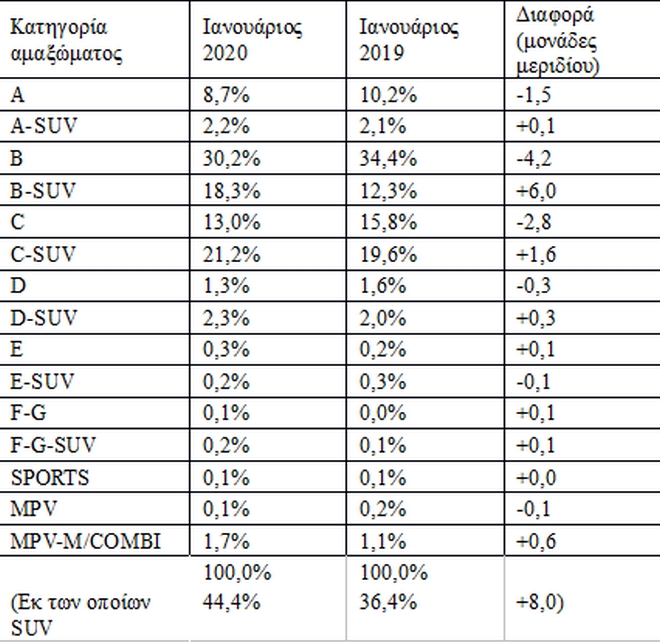 Τώρα, ιδιαίτερη αναφορά πρέπει να κάνουμε ως προς τις κατηγορίες αμαξωμάτων, καθώς τα SUV – Crossover, πλέον, καταλαμβάνουν το 44,4% της αγοράς, έναντι 36,4% πέρυσι κι αυτό επειδή λανσάρονται συνεχώς νέα μοντέλα. Μάλιστα, η κάθε κατηγορία αμαξώματος (Α,Β,C κ..λ.π.), εμφανίζει πτώση και τα μερίδια κερδίζουν οι υποκατηγορίες τους (A-SUV κ.λ.π.), που παρουσιάζουν ελκυστικά μοντέλα. Χαρακτηριστικά παραθέτουμε τον παρακάτω πίνακα: