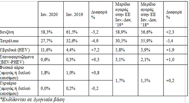 Επίσης, ενώ η βενζίνη, ήδη από το 2019, έχει κερδίσει κατά κράτος το πετρέλαιο, στις πωλήσεις νέων ΙΧ, εντούτοις τα υβριδικά μοντέλα, που συνδυάζουν κυρίως κινητήρα βενζίνης και μικρό ή μεγάλο ηλεκτρικό μοτέρ (αυτοφορτιζόμενα), εμφανίζουν τεράστια αύξηση (7,2%). Σταδιακά ανεβαίνουν και οι πωλήσεις των plug-in υβριδικών (μοτέρ βενζίνης + ηλεκτρικό μοτέρ αλλά επαναφορτιζόμενα από πρίζα) και των αμιγώς ηλεκτρικών (BEV). Ανοδο παρουσιάζουν και τα αυτοκίνητα φυσικού αερίου, ενώ εξαφανίζονται οι πωλήσεις αυτοκινήτων με εργοστασιακή εγκατάσταση υγραερίου.
