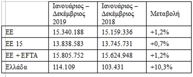 Εξάλλου, σε επίπεδο ΕΕ, με βάση τα στοιχεία του Ευρωπαϊκού Συνδέσμου Κατασκευαστών Αυτοκινήτων (www.acea.be), η αγορά των επιβατικών το 2019 εμφάνισε οριακή αύξηση, τη στιγμή που η Ελλάδα, έπειτα από μια βουτιά 5ετίας, κινείται, πλέον, ανοδικά. Συγκεκριμένα: