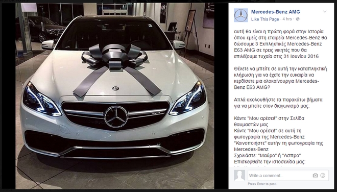 Πολλές φορές διάφοροι απατεώνες στήνουν ψεύτικους διαγωνισμούς για να αυξήσουν τα likes και εκείνους που τους ακολουθούν και να καρπωθούν τα οφέλη εξαπατώντας το κοινό. Ένα τέτοιο παράδειγμα είναι και ένας διαγωνισμός που κυκλοφορεί τελευταία, ο οποίος υπόσχεται “3 Εκπληκτικές Mercedes-Benz E63 AMG σε τρεις νικητές που θα επιλέξουμε τυχαία στις 31 Ιουνίου 2016”.