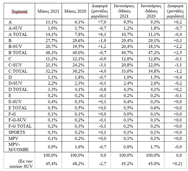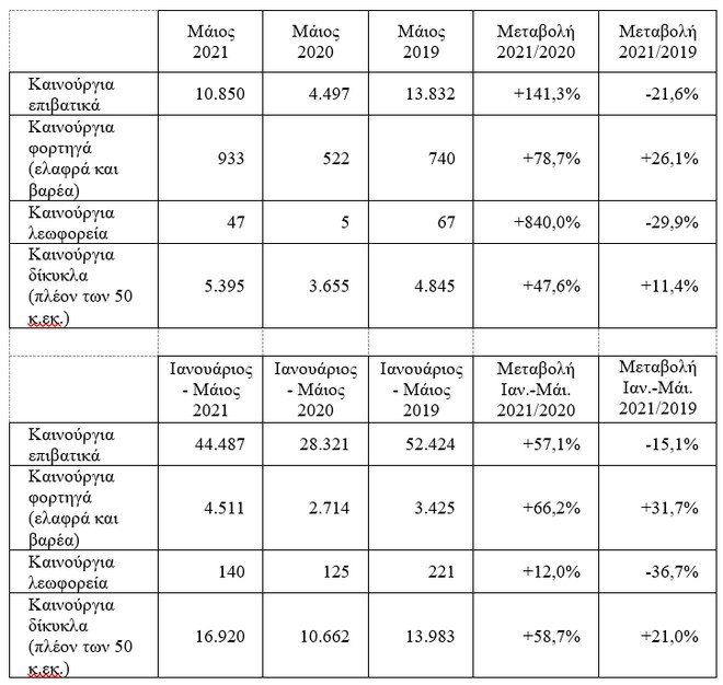 Η άρση των περιοριστικών μέτρων στις μετακινήσεις και η ενθάρρυνση του εμπορίου, έχει επιφέρει ευνοϊκότερο κλίμα στην αγορά, με αποτέλεσμα μόλις 15,1% να υπολείπεται το πρώτο 5μηνο του 2021, έναντι του 2019, καθώς το 2020 δεν μπορεί να μπει στην εξίσωση λόγω του αυστηρού lockdown.