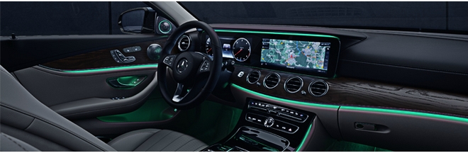 Όταν πέφτει το σκοτάδι, η εμπειρία στην καμπίνα μιας Mercedes γίνεται ανεπανάληπτη. Η νέα E-Class επιστρατεύει για τον εσωτερικό φωτισμό τεχνολογία LED, που διασφαλίζει τη διάρκεια, την οικονομία και την εξοικονόμηση ενέργειας. Το ίδιο ισχύει και για τον φωτισμό περιβάλλοντος που περιλαμβάνεται σε διάφορες γραμμές εξοπλισμού. Επιλέξτε ανάμεσα σε 64 χρώματα και δημιουργήστε το δικό σας, ξεχωριστό περιβάλλον που δεν θα συναντά κανείς σε κανένα άλλο αυτοκίνητο. Ο εξοπλισμός προσφέρει φωτεινές πινελιές σε διακοσμητικά στοιχεία, την κεντρική οθόνη, το ντουλαπάκι συνοδηγού στην κεντρική κονσόλα, τις χειρολαβές, τα εμπρός και πίσω μαρσπιέ, τις θήκες στις πόρτες, στην κονσόλα της οροφής αλλά και στα ηχεία tweeter (εάν το όχημα είναι εξοπλισμένο με το ηχοσύστημα Burmester® high-end 3D surround).