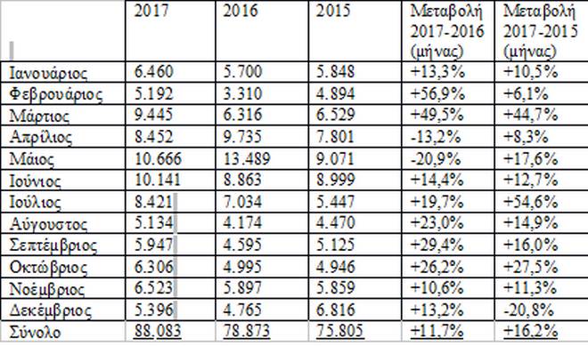 Με βάση, λοιπόν, τα πρωτογενή στοιχεία και την επεξεργασία του Συνδέσμου Εισαγωγέων Αντιπροσώπων Αυτοκινήτων, το μήνα Δεκέμβριο 2017 οι ταξινομήσεις καινούργιων επιβατικών παρουσίασαν αύξηση +13,2%, ως προς τον ίδιο μήνα του 2016.