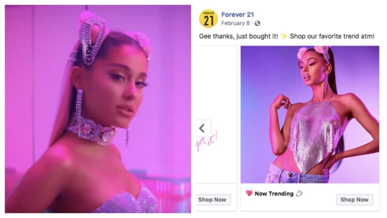 Η παραπλανητική καμπάνια έγινε κυρίως τον Ιανουάριο και τον Φεβρουάριο του 2019, πριν από την κυκλοφορία του δίσκου της Αριάνα Γκράντε “Thank you, Next” και πέρα από το μοντέλο σωσίας που την αντιγράφει στο video 7 Rings η Forever 21 φέρεται να χρησιμοποίησε δεκάδες φωτογραφίες και video χωρίς την προηγούμενη έγκριση της.