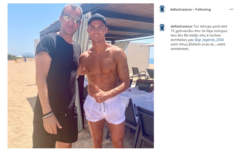 Αμφότεροι δεν αντιστάθηκαν στον πειρασμό να βγουν φωτογραφία με τον σούπερ σταρ της Γιουβέντους και της Εθνικής ομάδας της Πορτογαλίας ενώ ο Δέλλας θυμήθηκε και τον αγώνα που έχουν να δώσουν οι παλαίμαχοι άσοι του θριάμβου του 2004 με την Πορτογαλία στις 4 Ιουλίου στην οποία-ευτυχώς για τα ελληνικά χρώματα, ο Κριστιάνο δεν θα πάρει μέρος.
