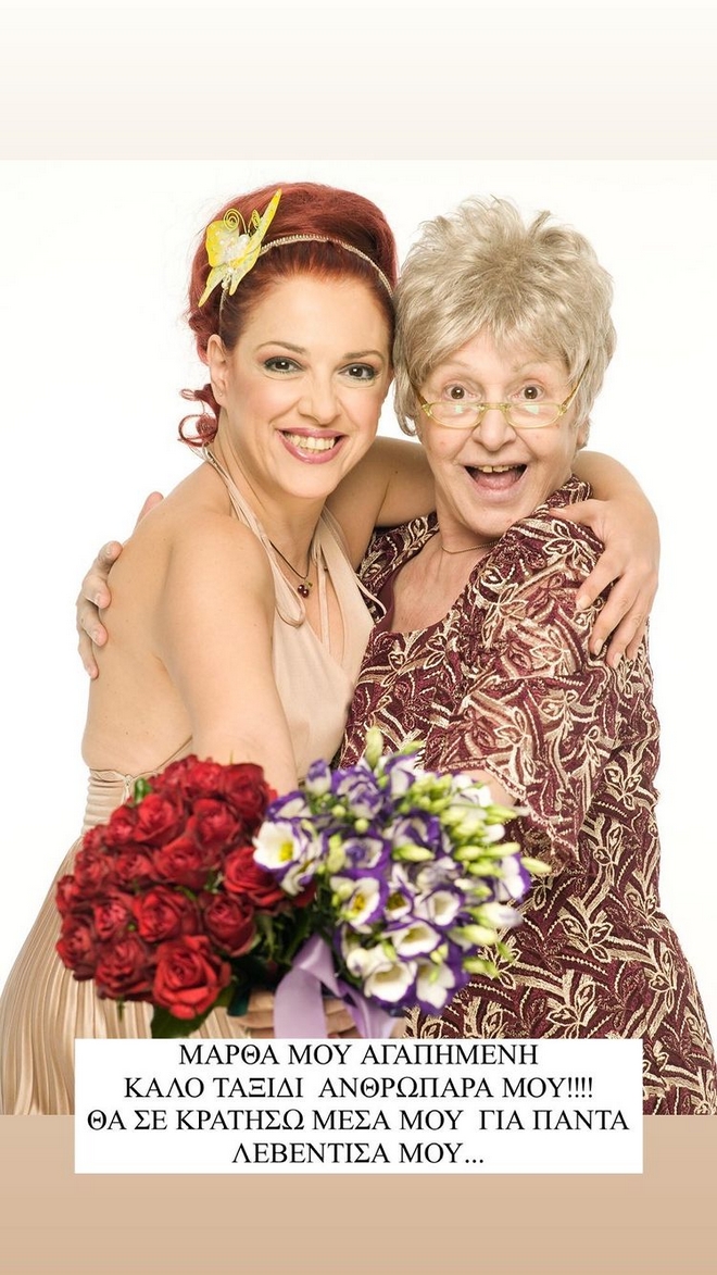 “Μάρθα μου αγαπημένη, καλό ταξίδι ανθρωπάρα μου! Θα σε κρατήσω μέσα μου για πάντα, λεβέντισσα μου”, έγραψε η Ελένη Ράντου σε ανάρτησή της στο Instagram.