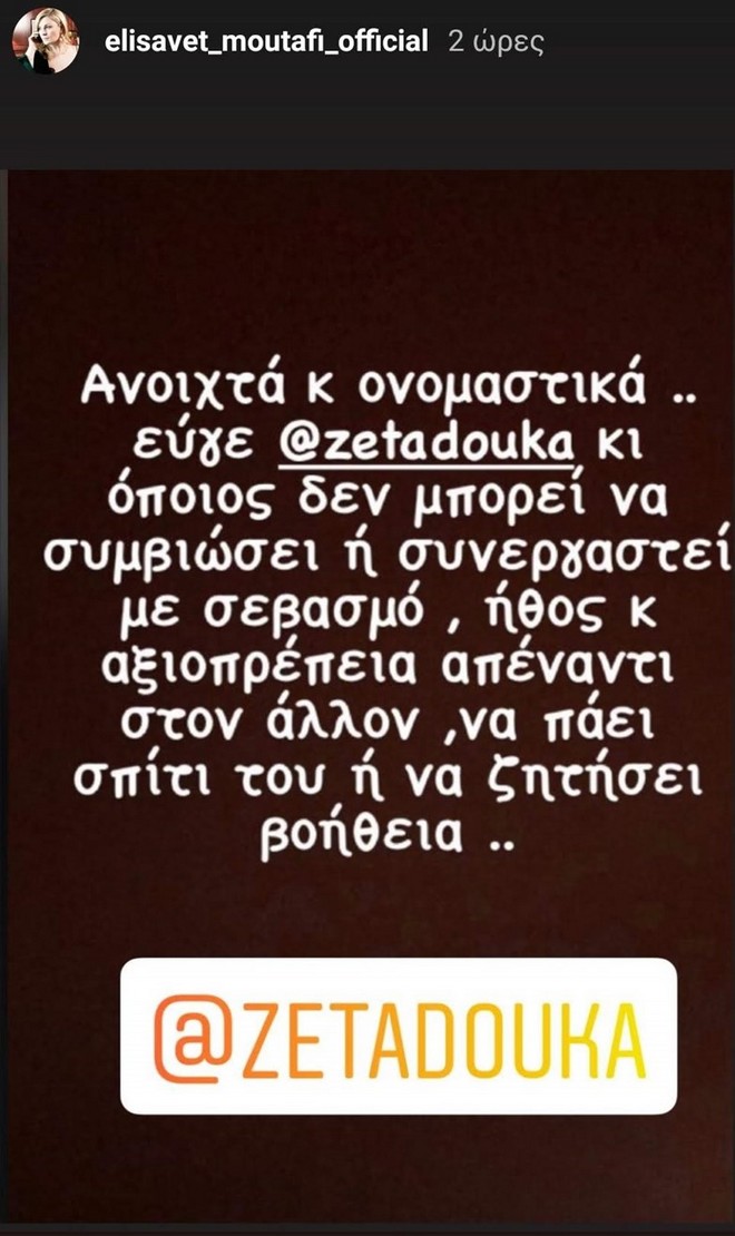 “Ανοιχτά και ονομαστικά…εύγε Ζέτα Δούκα και όποιος δεν μπορεί να συμβιώσει ή συνεργαστεί με σεβασμό, ήθος και αξιοπρέπεια στον άλλον, να πάει σπίτι του ή να ζητήσει βοήθεια..”, έγραψε η Ελισάβετ Μουτάφη.
