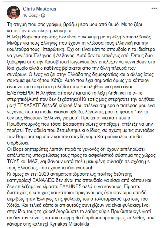 Κι όμως εν έτη 2020 αντιμετωπιζόμαστε ως πολίτες δεύτερης κατηγορίας! ΞΑΝΑΛΕΩ δεν είναι πιο σπουδαίο να είσαι από κάπου και δεν επιλέξαμε να είμαστε ΕΛΛΗΝΕΣ αλλά τι να κάνουμε; Είμαστε δυστυχώς η ευτυχώς και κάποιοι προγονοι μας έφτυσαν αίμα επειδή ακριβώς ήταν Έλληνες στις φυλακές του απολυταρχικού κράτους του Χότζα. Και τελικά κάποιοι απʼαυτούς συνεχίζουν να είναι φυλακισμένοι στην ίδια τους τη χώρα! Διορθώστε το λάθος κύριε Πρωθυπουργέ γιατί αν δεν τον κάνετε, κάποια στιγμή θα διορθώσουμε κι εμείς το λάθος που κάναμε στις κάλπες! Kyriakos Mitsotakis”.