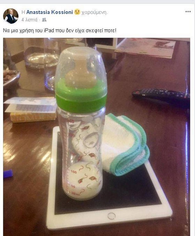 «Να μια χρήση του iPad που δεν είχα σκεφτεί ποτέ!», έγραψε με χιούμορ και δημοσίευσε μία φωτογραφία στην οποία μπιμπερό και σαλιάρα είναι πάνω στο tablet της, το οποίο όπως φαίνεται μετουσιώθηκε σε σουβέρ…