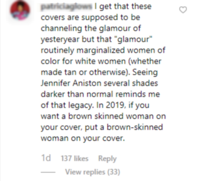 Το περιοδικό κυκλοφόρησε με αρκετά διαφορετικά εξώφυλλα, όλα με την Τζένιφερ Άνιστον, ωστόσο ένα από αυτά έγινε αντικείμενο κριτικής και λόγος διαφωνίας χιλιάδες χρηστών στο Instagram, καθώς η Αμερικανίδα ηθοποιός εμφανίζεται επεξεργασμένη και υπερβολικά μαυρισμένη.