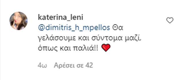 “Θα γελάσουμε και σύντομα μαζί, όπως και παλιά!!” σχολίασε η Κατερίνα Λένη, όλο νόημα, αφήνοντας μια καρδούλα μαζί με το σχόλιό της..