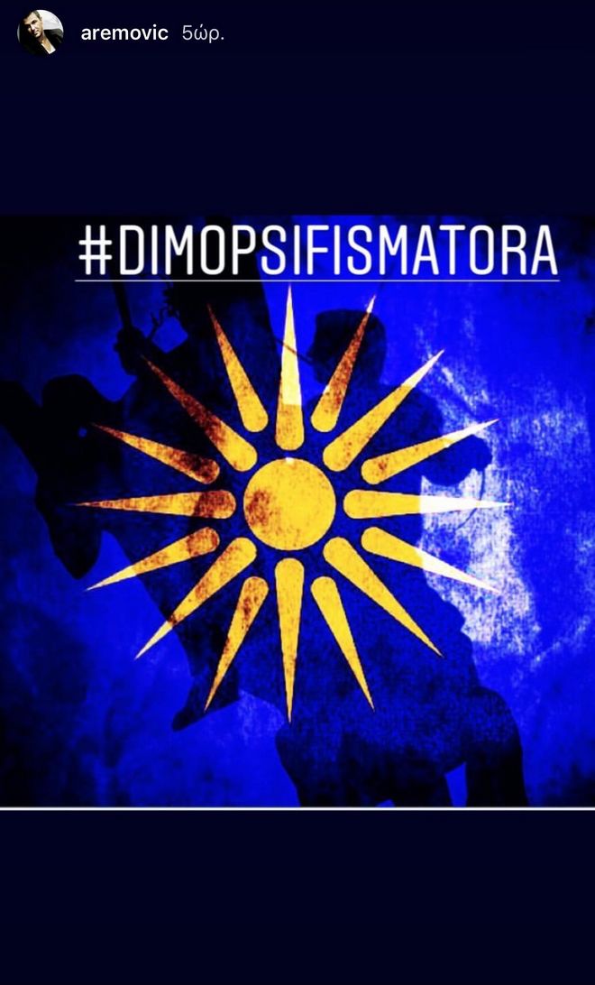 «Φίλοι μου καλησπέρα. Λόγω των εξελίξεων των ημερών έχω κι εγώ την ανάγκη να τοποθετηθώ για τα όσα διαδραματίζονται και αφορούν στην Μακεδονία! Δεν είμαι εγώ αυτός που θα κρίνει αν είναι σωστό η λάθος αυτό που γίνεται με την ονομασία την Μακεδονίας μας (αν και για μένα προσωπικά είναι έγκλημα) Αυτό θα το κρίνει η ιστορία. Το μόνο σίγουρο είναι ότι και για αυτήν την τεράστιας σημασίας απόφαση για τη χώρα μας θα πρέπει να την πάρει ο λαός με δημοψήφισμα!! Συμφωνώ και προσυπογράφω και εγώ για το δημοψήφισμα Για τη συμφωνία των Πρεσπών. ΕΙΝΑΙ ΔΙΚΑΙΟ, ΕΓΙΝΕ ΠΡΑΞΗ???» έγραψε, ενώ με story του στο Instagram προσκαλούσε σε «Δημοψήφισμα τώρα».