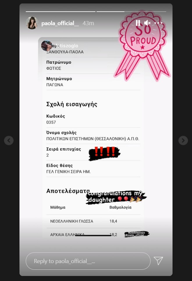 Πάολα: Περήφανη μαμά – Η 18χρονη κόρη της πέρασε στο πανεπιστήμιο