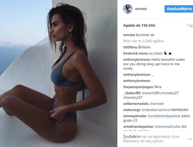 Τρεις φωτογραφίες από τις περσινές διακοπές της στην Ελλάδα δημοσίευσε η Emily Ratajkowski στον προσωπικό της λογαριασμό στο Instagram.