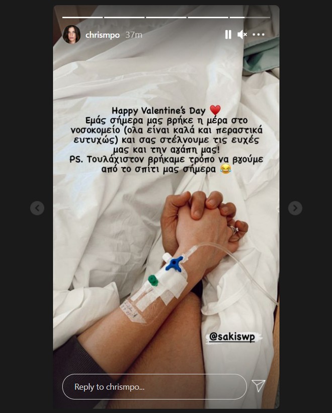 “Happy Valentine’s day. Εμάς σήμερα μας βρήκε η μέρα στο νοσοκομείο (όλα είναι καλά και περαστικά ευτυχώς) και σας στέλνουμε τις ευχές μας και την αγάπη μας. Υ.Γ. Τουλάχιστον βρήκαμε τρόπο να βγούμε από το σπίτι μας σήμερα”, έγραψε η ίδια.