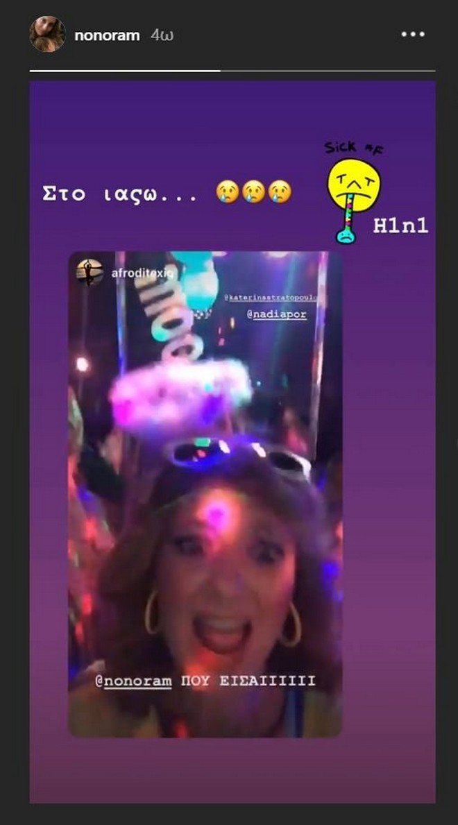 Συγκεκριμένα, απαντώντας σε instastory φίλης της που τη ρωτούσε που είναι, η γνωστή παρουσιάστρια απάντηση “Στο ιαςω…” συμπληρώνοντας την απάντησή της με τρία θλιμμένα emoji, καθώς και ένα μεγαλύτερο που έχει θερμόμετρο στο στόμα και γράφει στα αγγλικά “άρρωστη με Η1Ν1”.