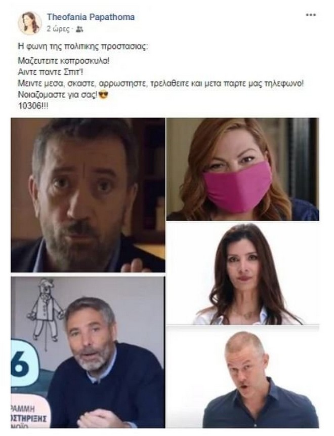 Η γνωστή ηθοποιός στην ανάρτησή της είχε ανεβάσει στιγμιότυπα από τα σποτ των Βίκυ Σταυροπούλου, Χρήστου Λούλη, Κατερίνας Λέχου, Θοδωρή Αθερίδη, Σπύρου Παπαδόπουλου και είχε γράψει: