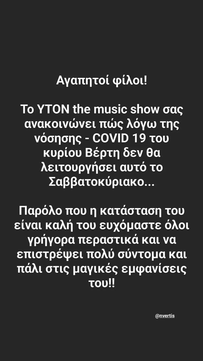 “Αγαπητοί φίλοι, το YTON the music show σας ανακοινώνει πως λόγω της νόσησης COVID-19 του κυρίου Βέρτη δε θα λειτουργήσει αυτό το Σαββατοκύριακο.