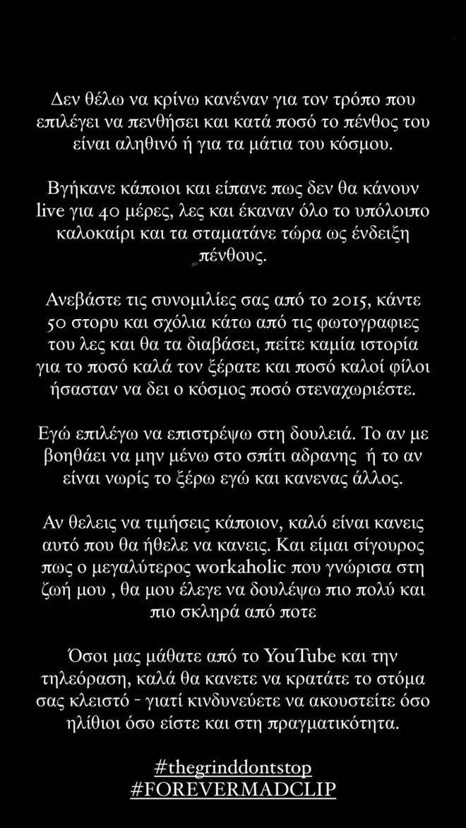 Ο καλλιτέχνης ανέφερε σε ένα στόρι του στο Instagram πως ο καθένας πενθεί με τον δικό του τρόπο. Συγκεκριμένα, γράφει: