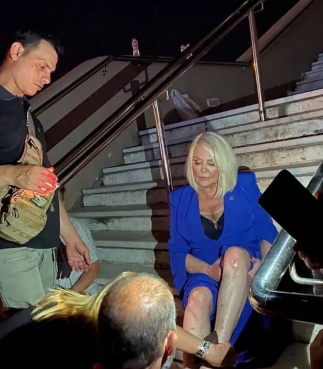 Σύμφωνα με όσα έχουν γίνει γνωστά μέχρι στιγμής, κατά τη διάρκεια της σύρραξης, τραυματίστηκε η Ρούλα Κορομηλά, που καθόταν κοντά στο σημείο του τσακωμού. Φωτογραφία που κυκλοφόρησε στο διαδίκτυο δείχνει την παρουσιάστρια να κάθεται σε σκαλιά και να δέχεται τις πρώτες βοήθειες, ούσα χτυπημένη στα πόδια.