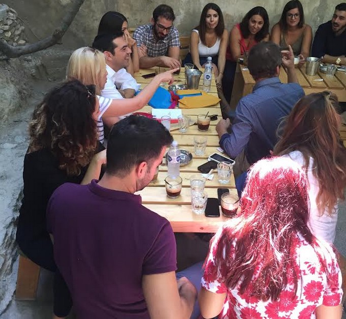 Ξεφεύγοντας από την πεπατημένη ο Αλέξης Τσίπρας επιλέγει να τροποποιήσει το καθιερωμένο κρασί – ουζεμεζέ που παραδοσιακά οι πολιτικοί αρχηγοί κερνούν τους δημοσιογράφους και να βάλει στο προσκήνιο τους νέους.