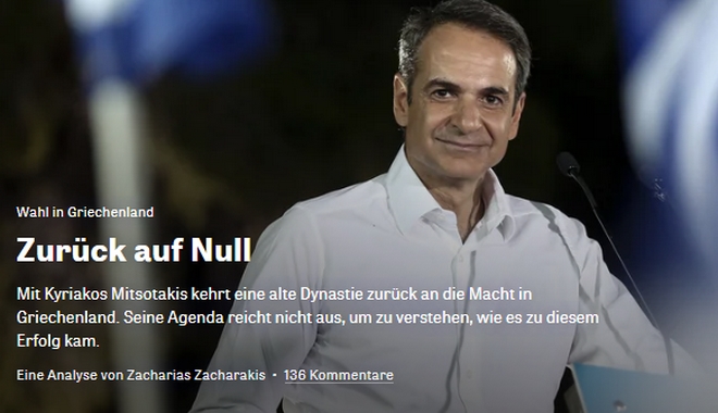 «Επιστροφή στο μηδέν», είναι ο τίτλος σχολίου της εφημερίδας «Die Zeit», η οποία αναφέρει ότι «με τον Κυριάκο Μητσοτάκη επιστρέφει στην εξουσία μια παλιά δυναστεία – η ατζέντα του δεν αρκεί προκειμένου να κατανοήσει κανείς πώς φτάσαμε σε αυτή την επιτυχία».