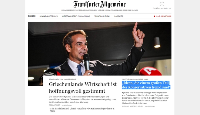«Καμία έκπτωση για τον Μητσοτάκη», είναι ο τίτλος σε σχόλιο της Frankfurter Allgemeine Zeitung, στο οποίο αναφέρεται ότι «μετά τον λάθος δρόμο που πήρε η Ελλάδα, όχι για πρώτη φορά, με τον Αλέξη Τσίπρα, οι Έλληνες μπορούν τώρα να ελπίζουν σε μια διέξοδο με την κυβέρνηση Μητσοτάκη», ενώ διατυπώνεται η εκτίμηση ότι «και αυτός ο δρόμος θα είναι μακρύς και δύσβατος – και μπορεί να κοστίσει νέα χρήματα στους Ευρωπαίους».