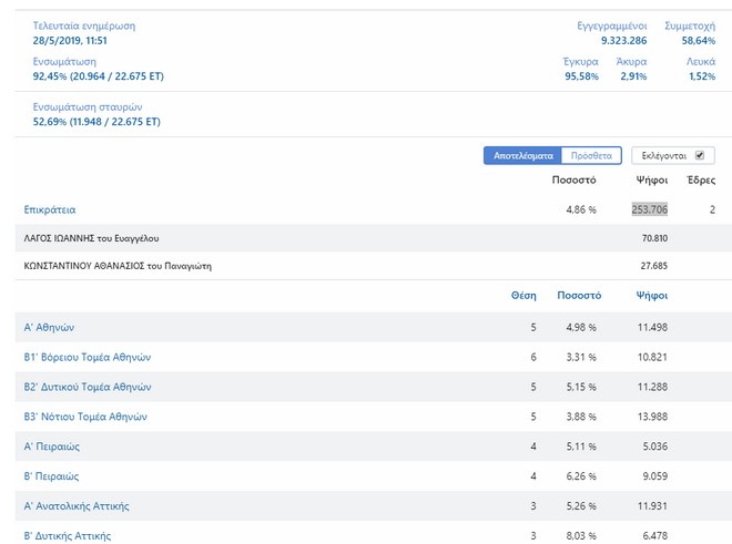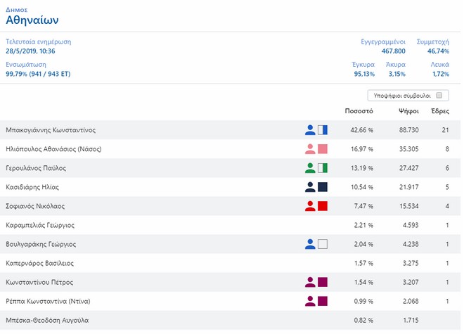 Τέλος, και στο Δήμο Αθηναίων τα εκλογικά ποσοστά του Ηλία Κασιδιάρη είναι πολύ πιο χαμηλά από τις εκτιμήσεις, φτάνοντας μόλις στο 10,54%.