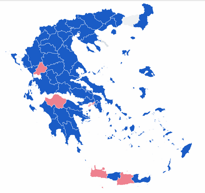 Πώς διαμορφώνεται ο χρωματικός χάρτης της Ελλάδας με τα μέχρι τώρα αποτελέσματα.