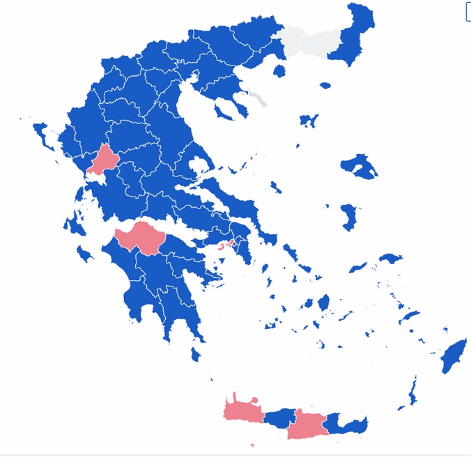 Η Νέα Δημοκρατία παίρνει την πρωτιά σ’ όλους τους νομούς εκτός από αυτούς της Αχαΐας, της Άρτας, των Χανίων και του Ηρακλείου και της περιφέρειας της Β’ Πειραιώς.