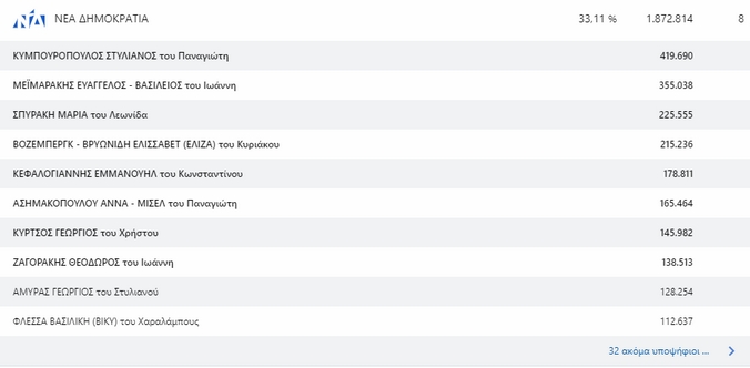 Η Νέα Δημοκρατία εκλέγει 8 ευρωβουλευτές. Μακράν πρώτος σε σταυρούς είναι μέχρι στιγμής ο Στέλιος Κυμπουρόπουλος με 419.177 ενώ έπεται ο Ευάγγελος Μεϊμαράκης με 354.521.