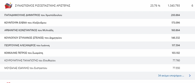 Στον ΣΥΡΙΖΑ την πρωτιά απολαμβάνει ο Δημήτρης Παπαδημούλης που έσπασε το φράγμα των 200.000 σταυρών ενώ εξαιρετική επίδοση κατέγραψε η Ελενα Κουντουρά (172.973) παρά το γεγονός ότι δεν προέρχεται από τον ΣΥΡΙΖΑ και την Αριστερά.