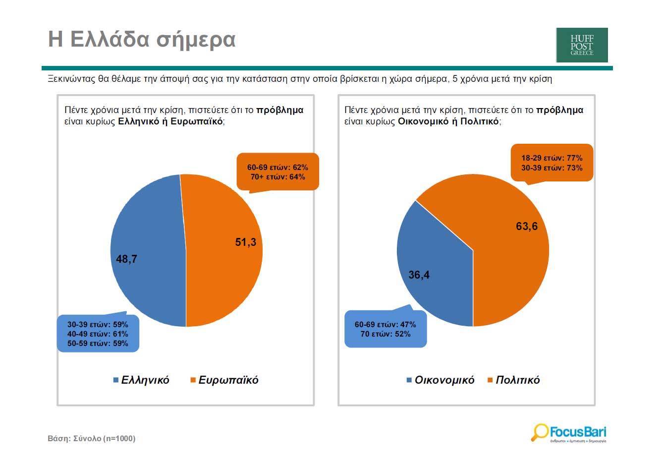 Σήμερα και πέντε χρόνια μετά την κρίση και τα μνημόνια που ακολούθησαν η πλειοψηφία των ερωτηθέντων πιστεύουν ότι το πρόβλημα είναι ευρωπαϊκό (51,3%) και πολιτικό (63,6% ) και δευτερευόντως ελληνικό (48,7%) και οικονομικό (36,4%).