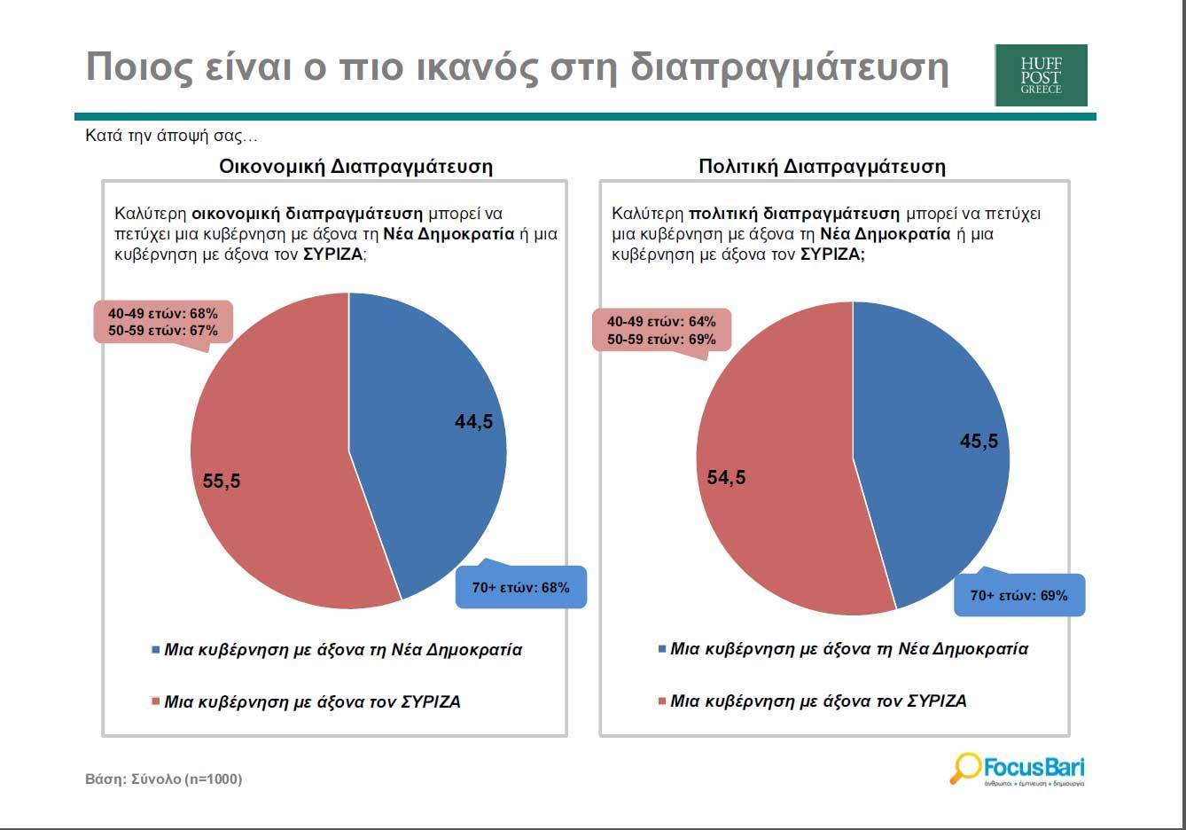 Ο ΣΥΡΙΖΑ χαρακτηρίζεται ως ο καλύτερος διαπραγματευτής, απέναντι στους δανειστές και σε οικονομικό (55,5%) και σε πολιτικό επίπεδο (54,5%) και υπερτερεί στις ηλικίες μέχρι 59 ετών, ενώ στις μεγαλύτερες ηλικίες άνω των 70 ετών το προβάδισμα έχει η ΝΔ.