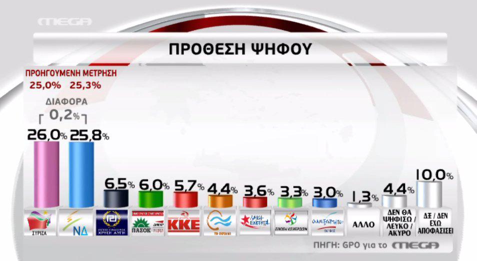 Δημοσκόπηση της GPO για τον τηλεοπτικό σταθμό Mega, μια εβδομάδα πριν τις εκλογές της 20ης Φεβρουαρίου, φέρνει πρώτο κόμμα τον ΣΥΡΙΖΑ