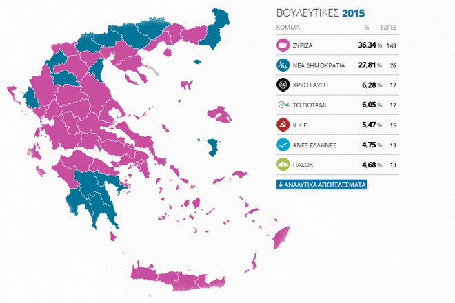 Με τη ΝΔ εκλέγεται ο Γιάννης Τραγάκης, με το ΚΚΕ η Διαμάντω Μανωλάκου, με τη Χρυσή Αυγή ο Γιάννης Λαγός, με τους Ανεξάρτητους Έλληνες ο Δημήτρης Καμμένος και με το Ποτάμι ο Σταύρος Θεοδωράκης.