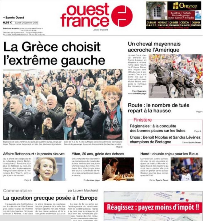 “Η Ελλάδα επιλέγει την άκρα αριστερά”, είναι ο σημερινός τίτλος της Ouest France ενώ αναφέρει χαρακτηριστικά “Εκλογές στην Ελλάδα. Γύρισε η σελίδα της λιτότητας”, κάνοντας ιδιαίτερη αναφορά στις δηλώσει του κ. Τσίπρα για τα καταστροφικά μέτρα λιτότητας.