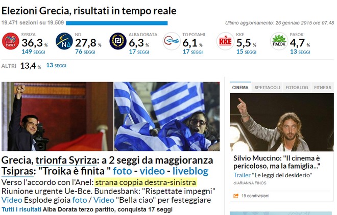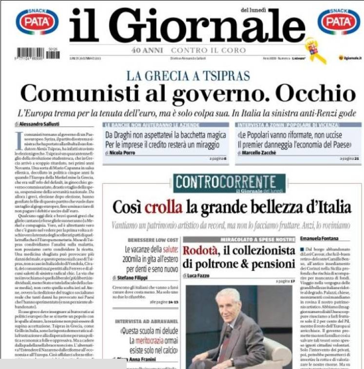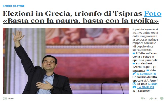 Την ίδια στιγμή, η Corriere Della Sera γράφει “Εκλογές στην Ελλάδα, θρίαμβος για τον Τσίπρα. Φτάνει με τον φόβο, φτάνει με τη τρόικα”. Παράλληλα, η Il Giornale κυκλοφορεί με τίτλο “Η Ελλάδα ψήφισε κατά της ευρωκρατίας. Τσίπρας: Η τρόικα ανήκει στο παρελθόν”. “Εκλογές στην Ελλάδα, ο Τσίπρας μπροστά”, είναι ο χαρακτηριστικός τίτλος της Il Gazzettino.