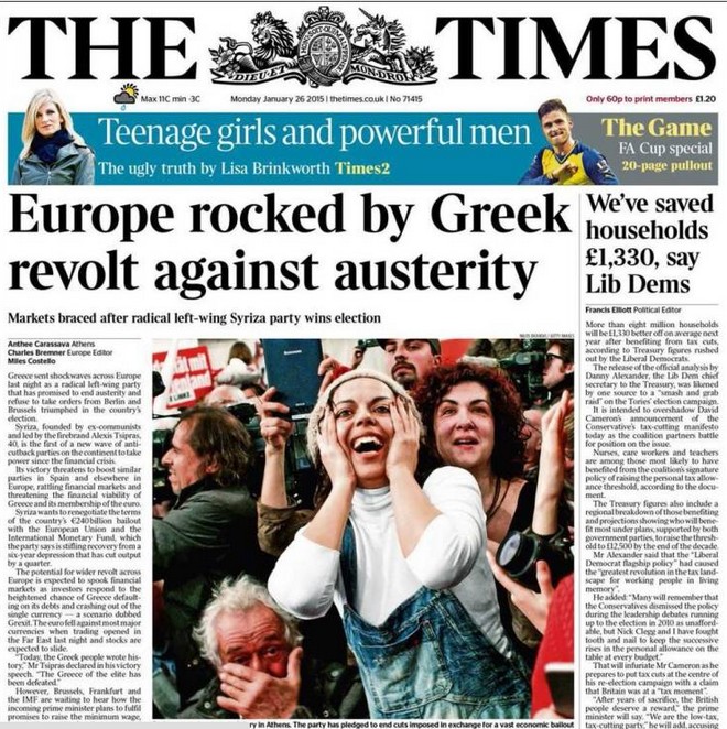 “Η Ευρώπη συγκλονίστηκε από την ελληνική επανάσταση κατά της λιτότητας”, είναι ο σημερινός τίτλος της εφημερίδας The Times, που επισημαίνει την ανησυχία των αγορών από την εκλογή του αντιμνημονιακού ΣΥΡΙΖΑ.