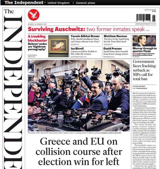 Ενώ η Independent, κυκλοφορεί με τίτλο “Ελλάδα και ΕΕ σε σύγκρουση μετά τη νίκη της Αριστεράς στις εκλογές” και εκφράζει φόβους για πιθανή οικονομική κατάρρευση, μετά από το σαφές μήνυμα κατά της λιτότητας που έχουν επιβάλλει Βερολίνο και Βρυξέλλες.