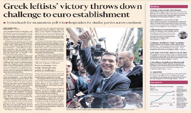 Χαρακτηριστική είναι η αναφορά των Financial Times, που κυκλοφορούν με πρωτοσέλιδο την νίκη του ΣΥΡΙΖΑ, με τον τίτλο “Η Ελληνική αριστερά εγκαταλείπει την ανάγκη για τη σταθερότητα του ευρώ”, τονίζοντας πως η ιστορική νίκη του ΣΥΡΙΖΑ αποτελεί έμπνευση για τα κόμματα της Αριστεράς στην Ευρώπη.