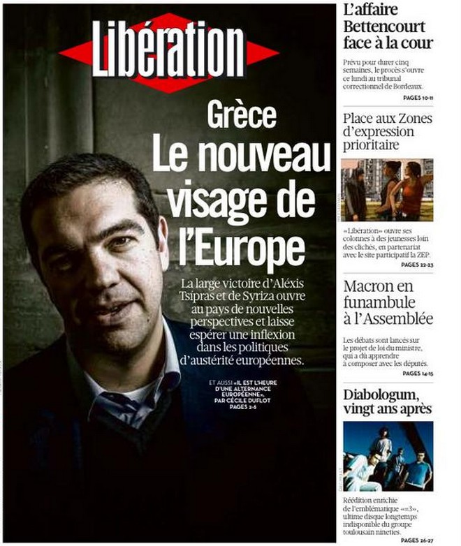 “Ελλάδα, το νέο πρόσωπο της Ευρώπης”, είναι ο χαρακτηριστικός τίτλος της Lieration, που παρατηρεί πως η Αλέξης Τσίπρας θα ανακηρυχθεί άμεσα πρωθυπουργός της χώρας, παρατηρώντας πως η νέα κυβέρνηση θα στοχεύει στην άμεση απαλλαγή από το ολιγαρχικό και πελατειακό σύστημα εξουσίας, ψηφίζοντας υπέρ ενός κόμματος που επαγγέλλεται μία πραγματική μεταρρύθμιση του Κράτους.