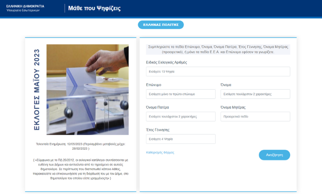 Οι πολίτες μπορούν με λίγα μόλις βήματα να μάθουν σε ποιο εκλογικό κέντρο θα ψηφίσουν, μέσα από την ιστοσελίδα του Υπουργείου Εσωτερικών, συμπληρώνοντας τα στοιχεία τους στην ειδική σχετική φόρμα με τίτλο “Μάθε πού ψηφίζεις”.