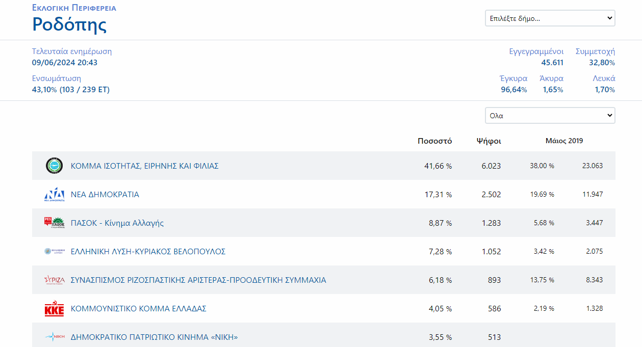 Στη Ροδόπη με καταμετρημένο το 43% των ψήφων, το Κόμμα Ισότητας Ειρήνης και Φιλίας (ΚΙΕΦ) συγκεντρώνει 41%, δεύτερο κόμμα είναι η ΝΔ στο 17% και τρίτο το ΠΑΣΟΚ με 8,87%.