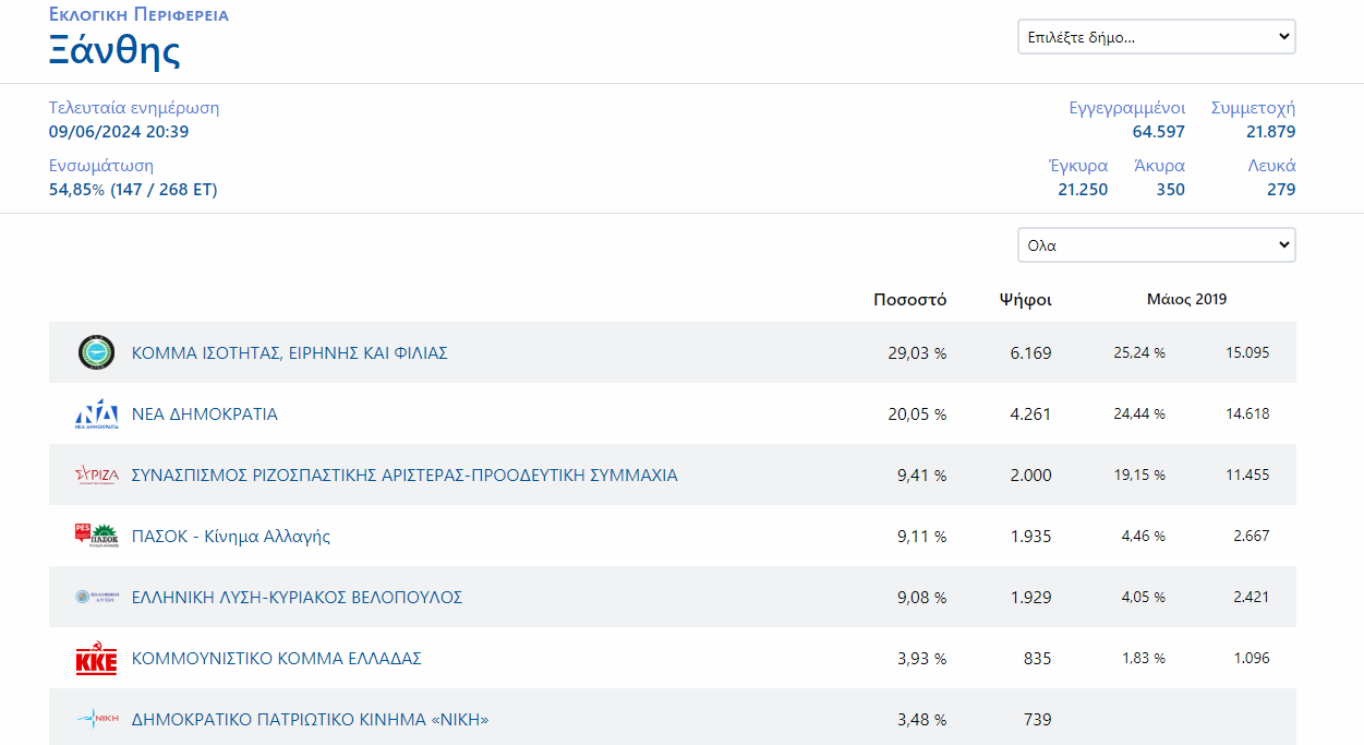 Ειδικότερα, στην Ξάνθη με την ενσωμάτωση να βρίσκεται 55%, το Κόμμα Ισότητας Ειρήνης και Φιλίας (ΚΙΕΦ) συγκεντρώνει 29%, η ΝΔ βρίσκεται στο 20% και ο ΣΥΡΙΖΑ στο 9%.