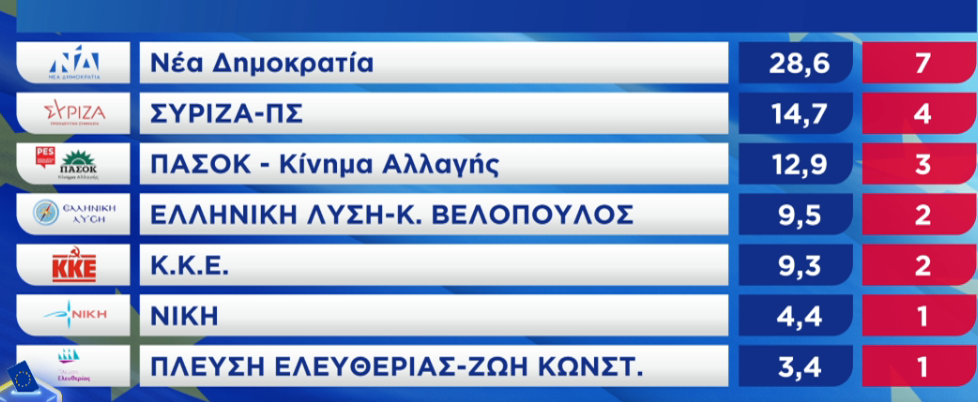 Με την ενσωμάτωση στο 64%, ο κ. Μπακάκος ανακοίνωσε πως 7 κόμματα εκλέγουν βουλευτές στην Ευρωβουλή, με την Φωνή Λογικής της Αφροδίτης Λατινοπούλου να μένει τελικά εκτός.